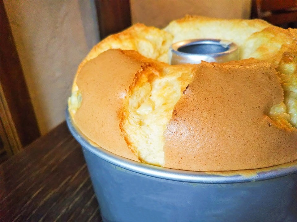 焼いているうちに「ドーメ」の欠片たちは少しずつ溶けて、メレンゲとなじんで、あの独特の「ドーメ」の香りと味が濃淡になって焼きあがると「濃厚チーズシフォン」が完成します。